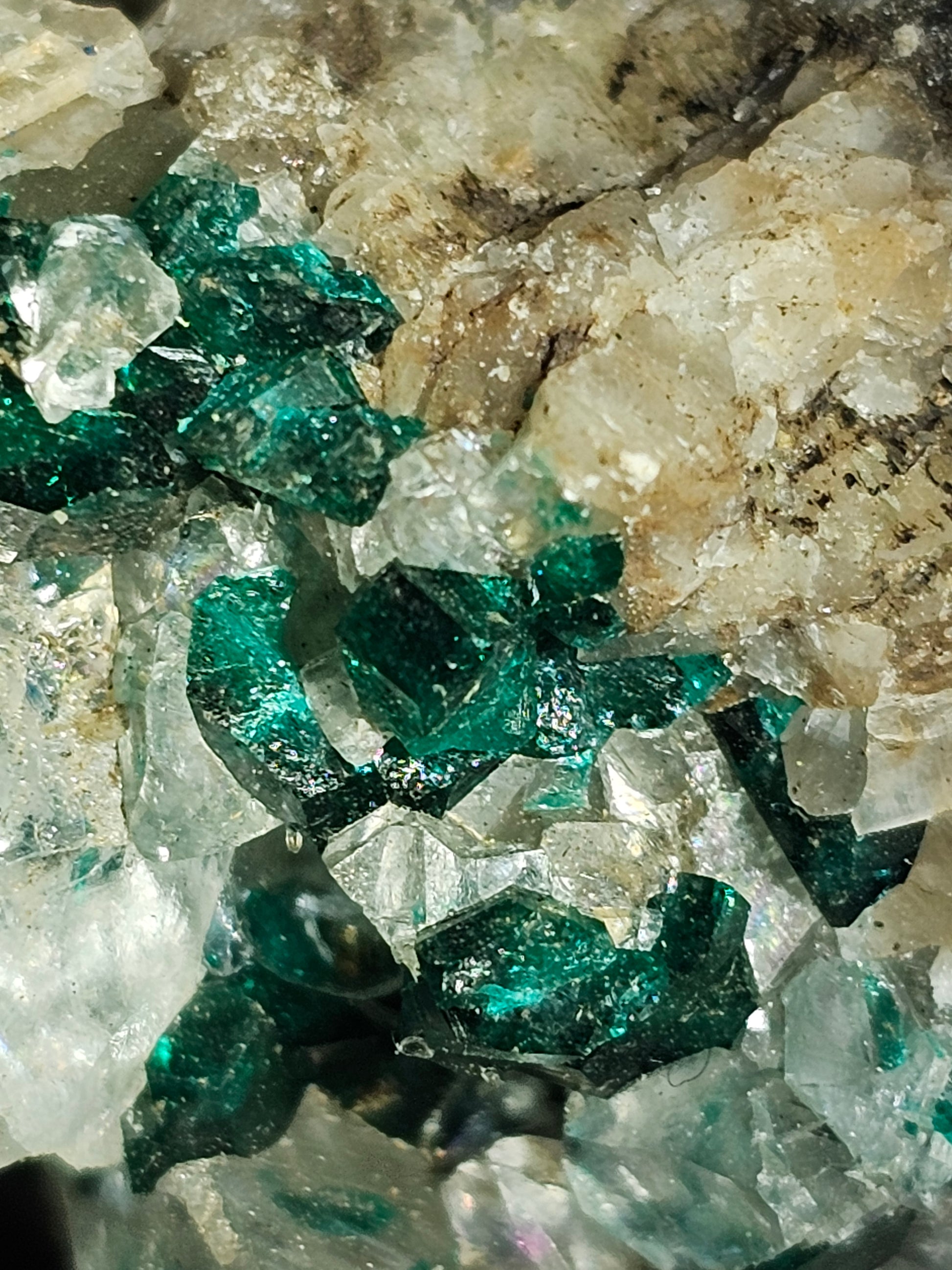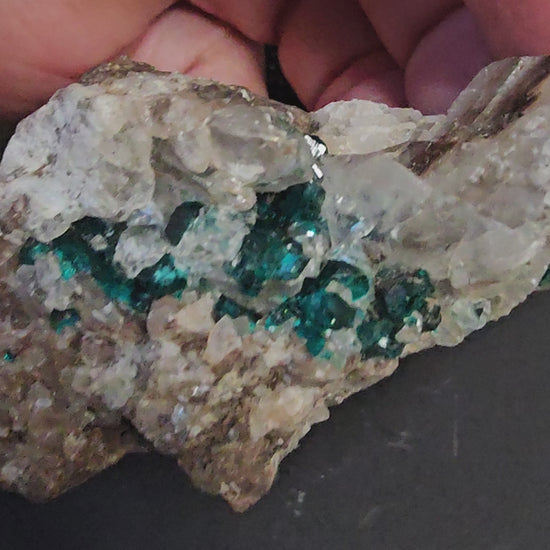 This stunning dioptase specimen weighs in at 79.2 grams and features vibrant emerald-green crystals on a quartz-calcite crystalline matrix.